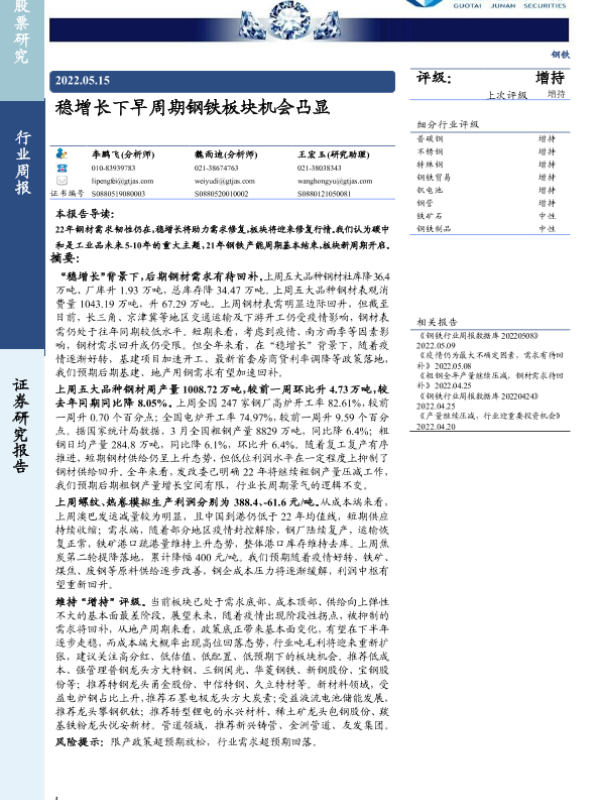 【国泰君安证券】【20220515】20220515-国泰君安-钢铁行业周报:稳增长下早周期钢铁板块机会凸显-24页