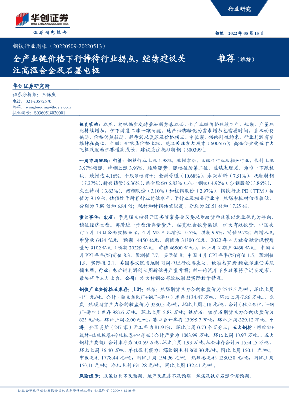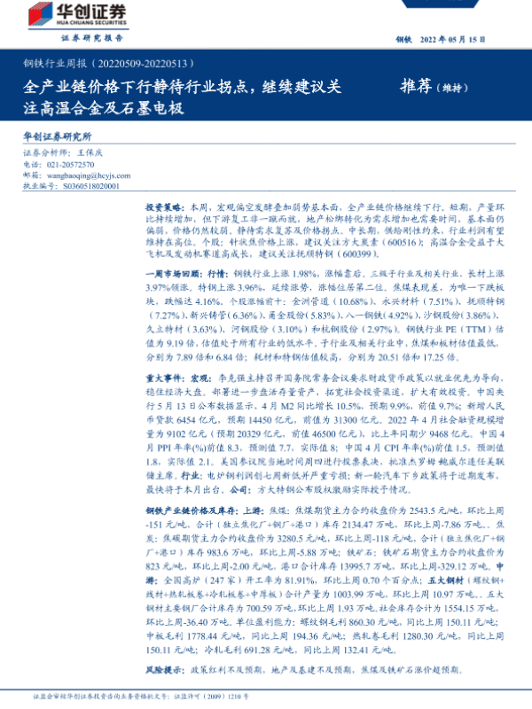 【华创证券】【20220515】20220515-华创证券-钢铁行业周报:全产业链价格下行静待行业拐点,继续建议关注高温合金及石墨电极-17页