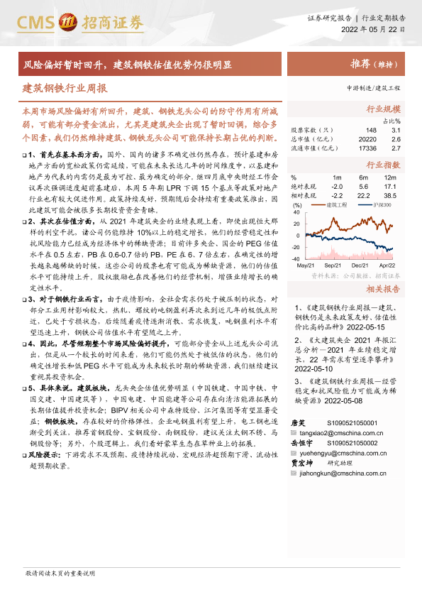 【海通证券】【20220522】建筑钢铁行业周报:风险偏好暂时回升,建筑钢铁估值优势仍很明显-3页