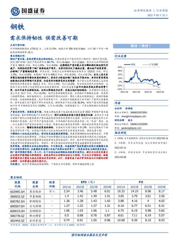 【国盛证券】【20220522】钢铁:需求保持韧性 供需改善可期-15页