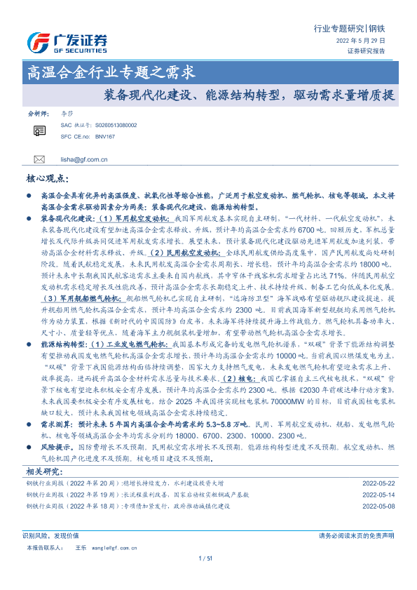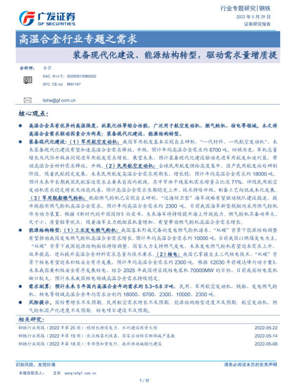 【广发证券】【20220529】高温合金行业专题之需求:装备现代化建设、能源结构转型,驱动需求量增质提-51页