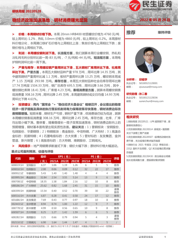 【民生证券】【20220528】20220528-民生证券-钢铁周报:稳经济政策加速落地,钢材消费曙光显现-19页