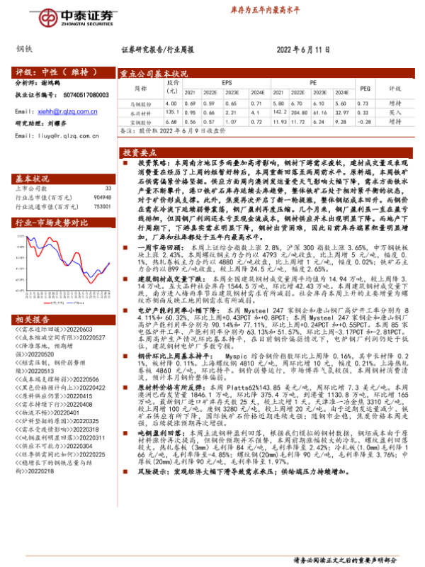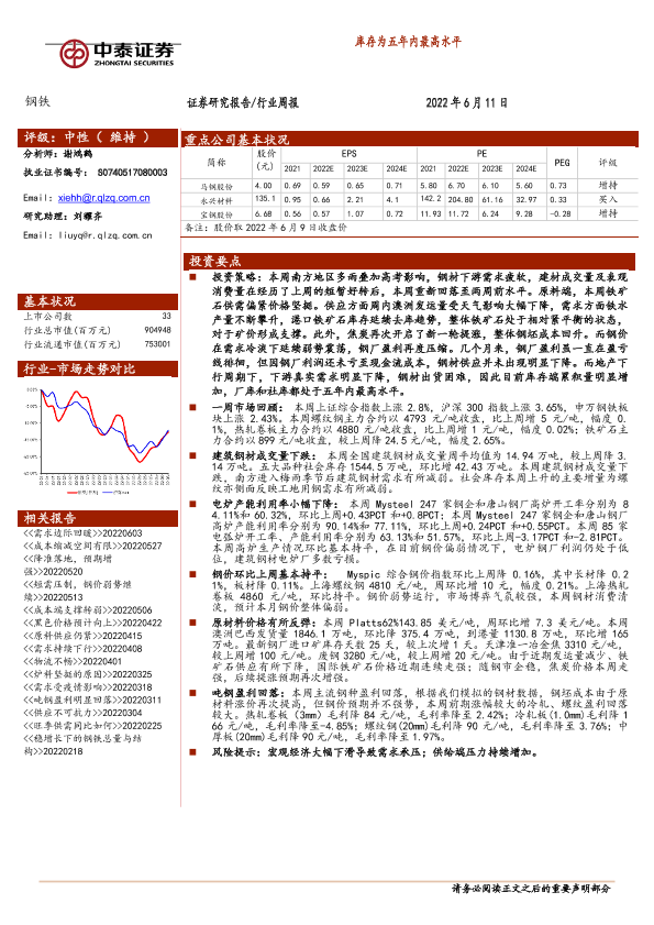 【中泰证券】【20220611】20220611-中泰证券-钢铁行业周报:库存为五年内最高水平-11页