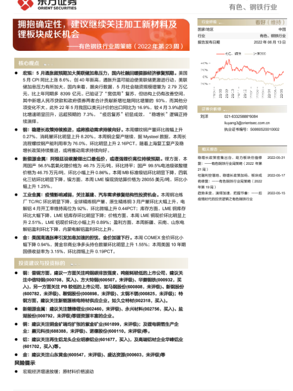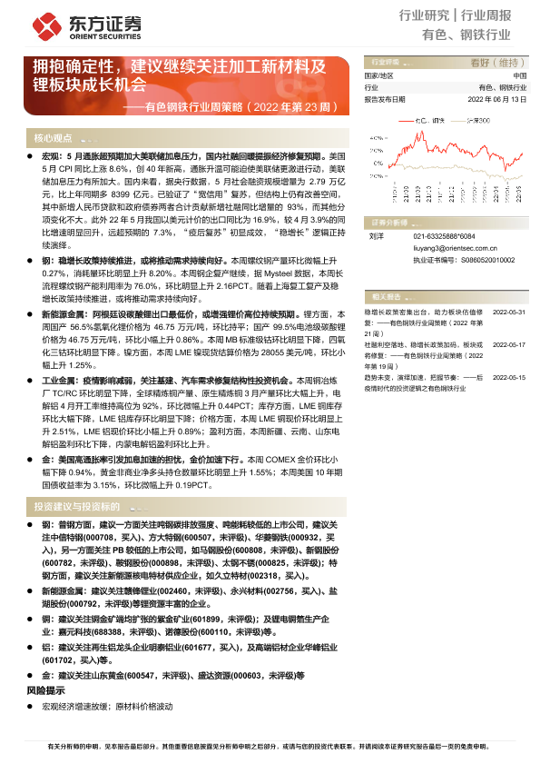 【东方证券】【20220613】20220613-东方证券-有色钢铁行业周策略(2022年第23周):拥抱确定性,建议继续关注加工新材料及锂板块成长机会-34页