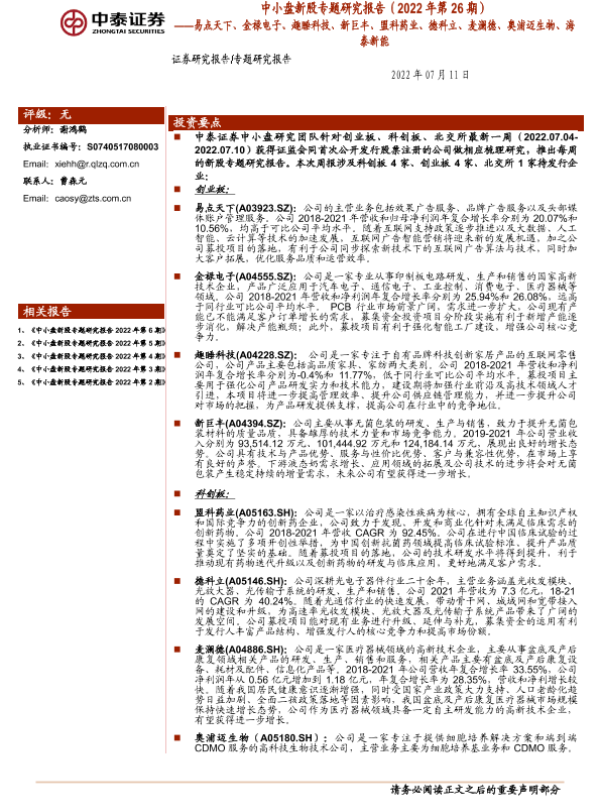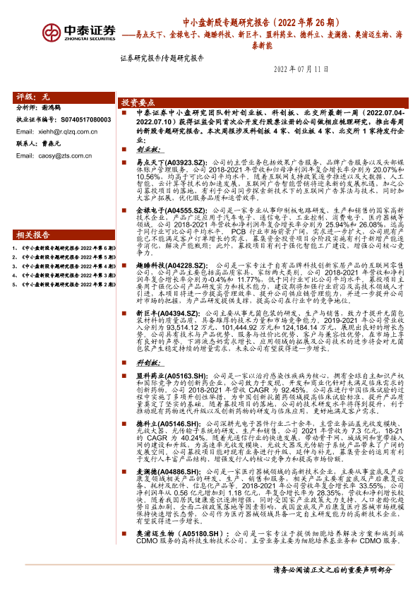 【中泰证券】【20220711】研究报告(2022年第26期):易点天下、金禄电子、趣睡科技、新巨丰、盟科药业、德科立、麦澜德、奥浦迈生物、海泰新能-50页