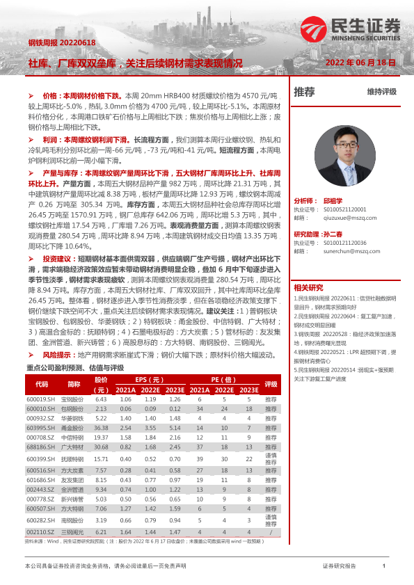 【民生证券】【20220618】20220618-民生证券-钢铁周报:社库、厂库双双垒库,关注后续钢材需求表现情况-20页
