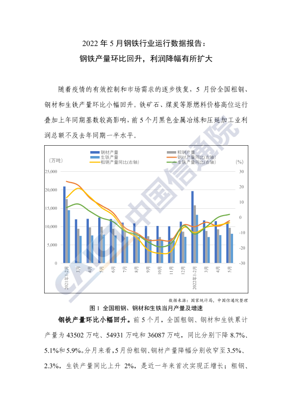 【中国信通院】【20220701】2022年5月钢铁行业运行数据报告:钢铁产量环比回升,利润降幅有所扩大-4页
