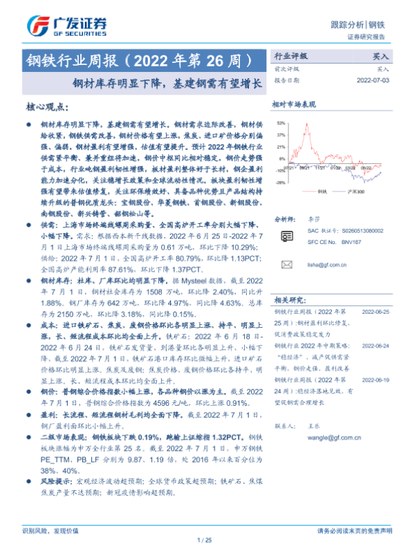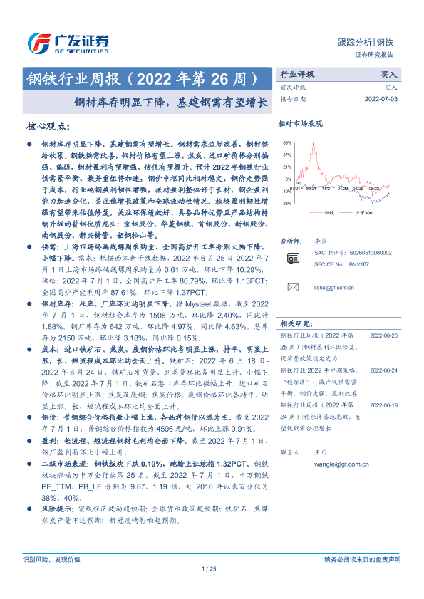 【广发证券】【20220703】20220703-广发证券-钢铁行业周报(2022年第26周):钢材库存明显下降,基建钢需有望增长-25页