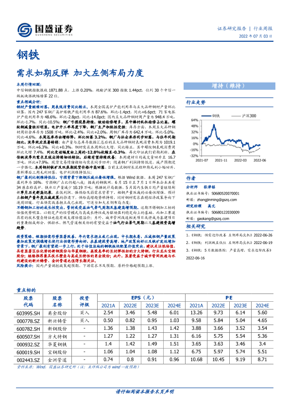 【国盛证券】【20220703】20220703-国盛证券-钢铁行业周报:需求如期反弹 加大左侧布局力度-15页