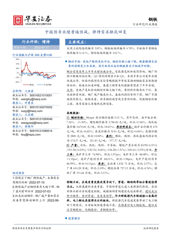 【华安证券】【20220717】20220717-华安证券-钢铁行业周报:中报预告业绩普遍预减,静待需求触底回复-16页