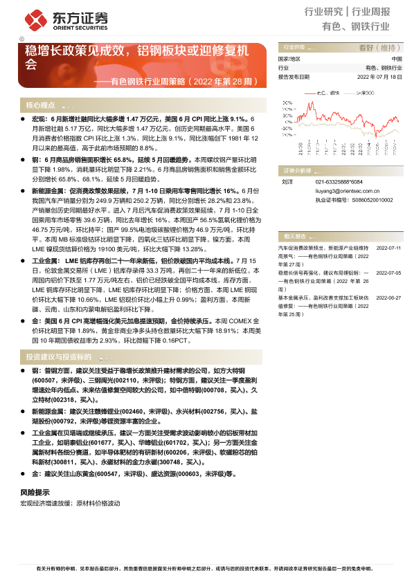 【东方证券】【20220718】20220718-东方证券-有色钢铁行业周策略(2022年第28周):稳增长政策见成效,铝钢板块或迎修复机会-38页