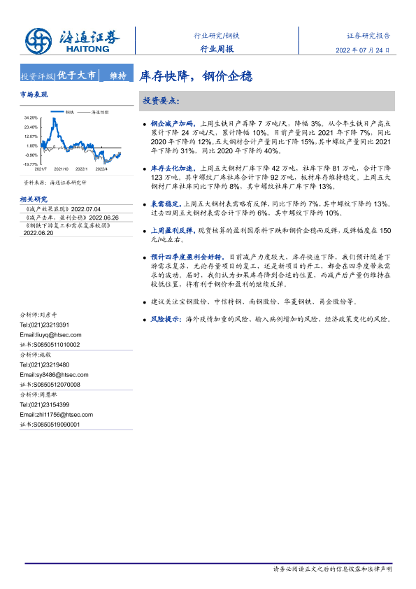 【海通证券】【20220724】20220724-海通证券-钢铁行业周报:库存快降,钢价企稳-12页