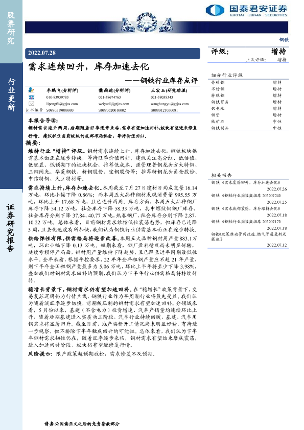 【国泰君安证券】【20220728】20220728-国泰君安-钢铁行业库存点评:需求连续回升,库存加速去化-3页