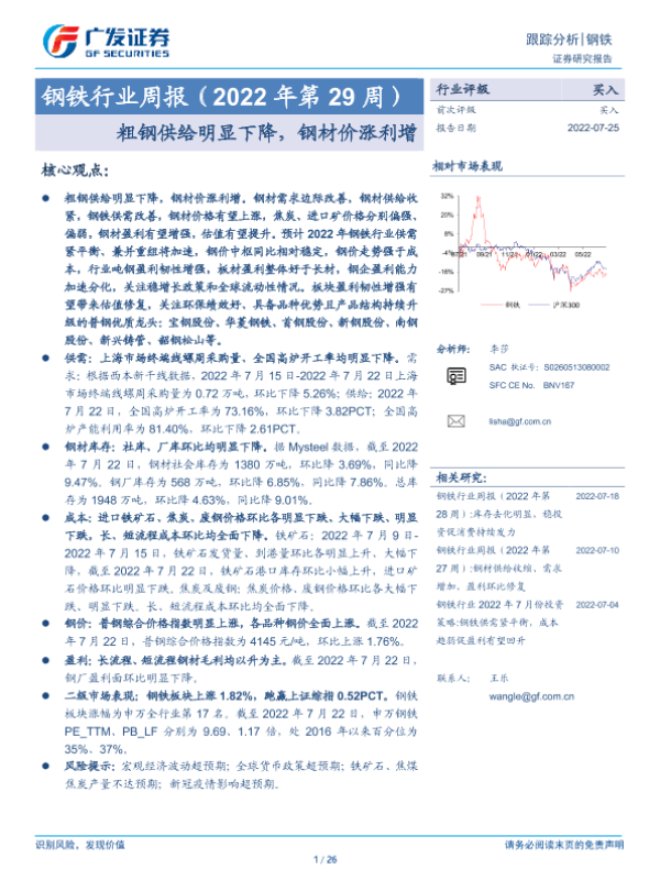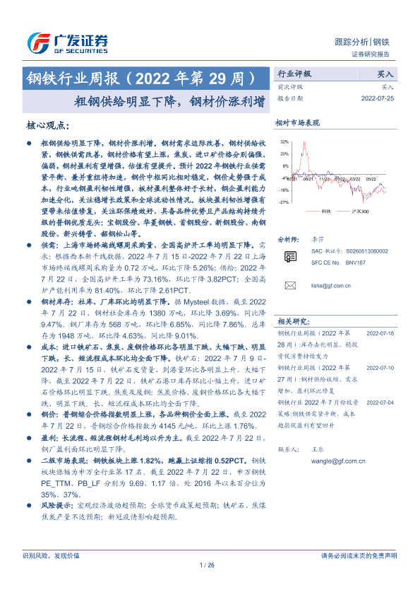 【广发证券】【20220725】20220725-广发证券-钢铁行业周报(2022年第29周):粗钢供给明显下降,钢材价涨利增-26页