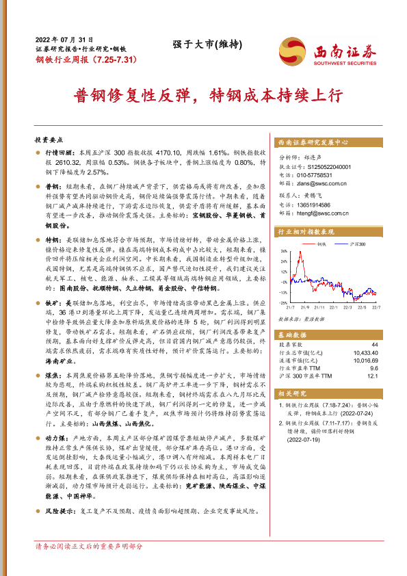 【西南证券】【20220731】20220731-西南证券-钢铁行业周报:普钢修复性反弹,特钢成本持续上行-15页