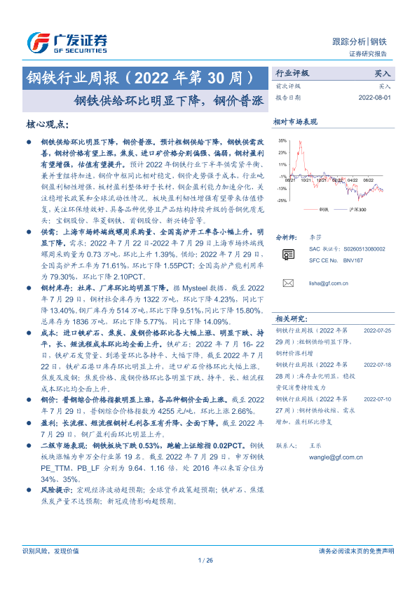 【广发证券】【20220801】钢铁行业周报(2022年第30周):钢铁供给环比明显下降,钢价普涨-26页