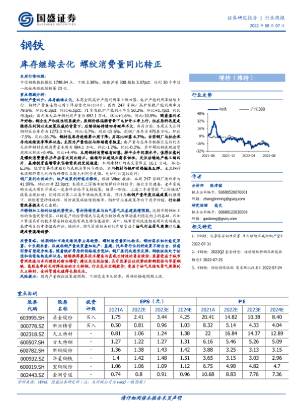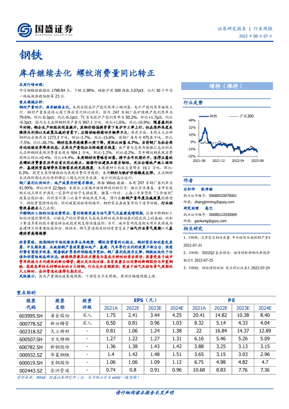 【国盛证券】【20220807】20220807-国盛证券-钢铁行业周报:库存继续去化 螺纹消费量同比转正-16页