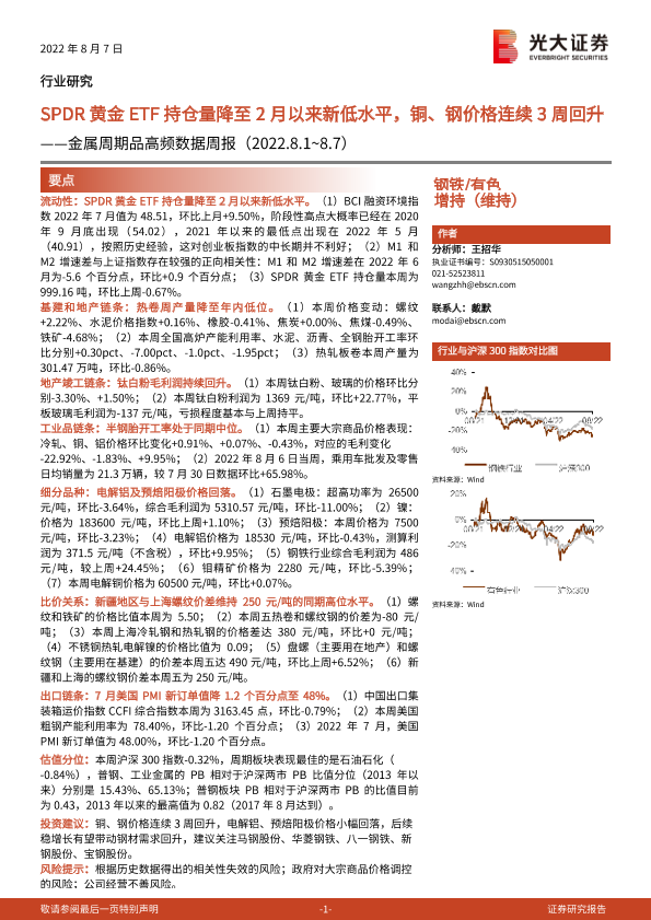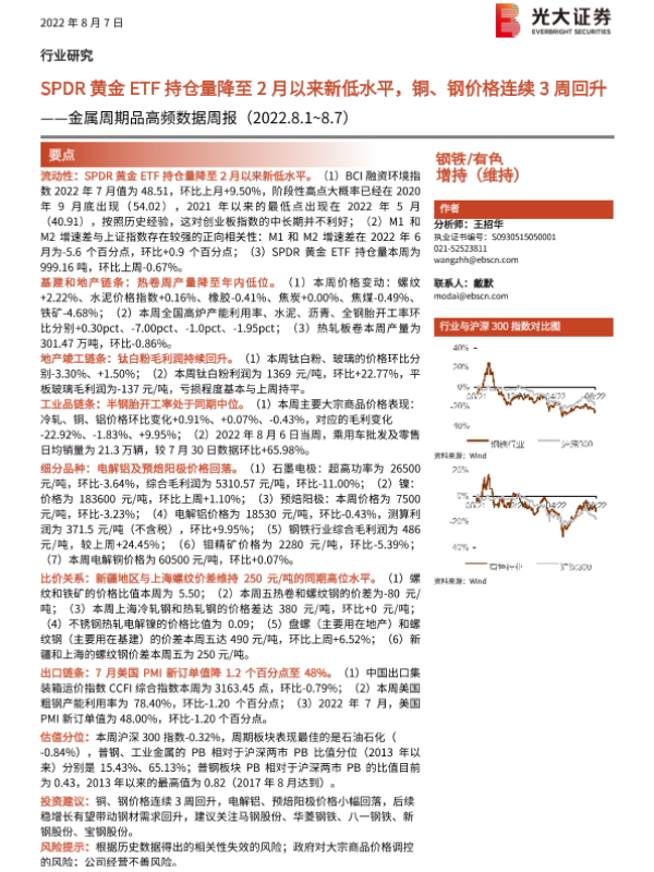 【光大证券】【20220807】20220807-光大证券-金属周期品高频数据周报:SPDR黄金ETF持仓量降至2月以来新低水平,铜、钢价格连续3周回升-26页