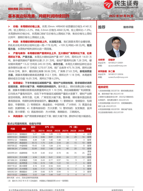 【民生证券】【20220806】20220806-民生证券-钢铁周报:基本面边际改善,吨钢利润持续回升-20页