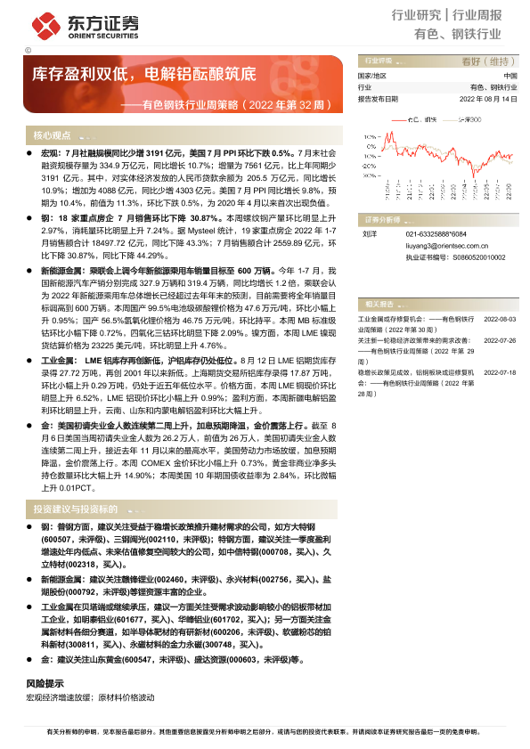【东方证券】【20220814】20220814-东方证券-有色钢铁行业周策略(2022年第32周):库存盈利双低,电解铝酝酿筑底-34页