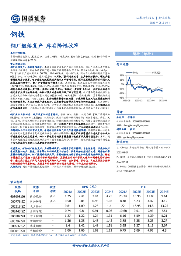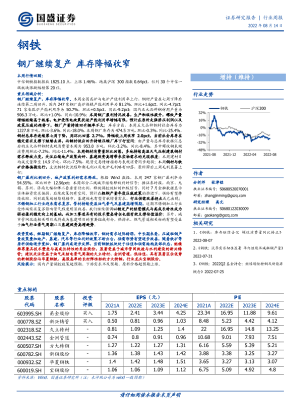 【国盛证券】【20220814】20220814-国盛证券-钢铁:钢厂继续复产 库存降幅收窄-16页