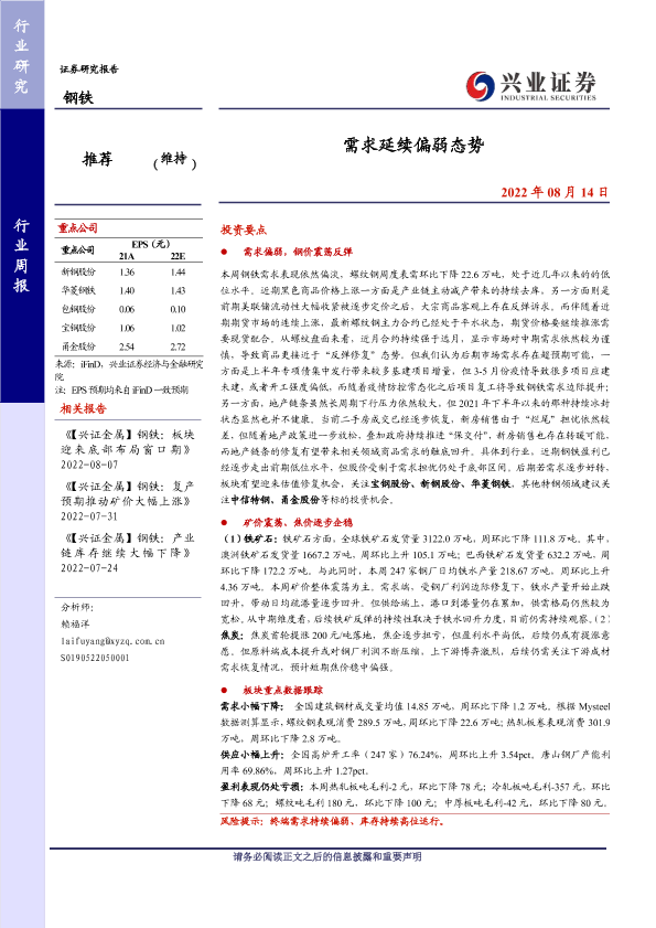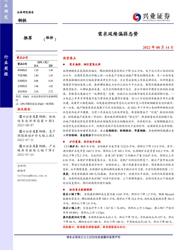 【兴业证券】【20220814】20220814-兴业证券-钢铁行业周报:需求延续偏弱态势-11页
