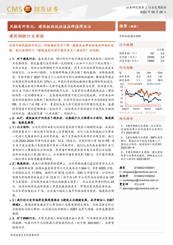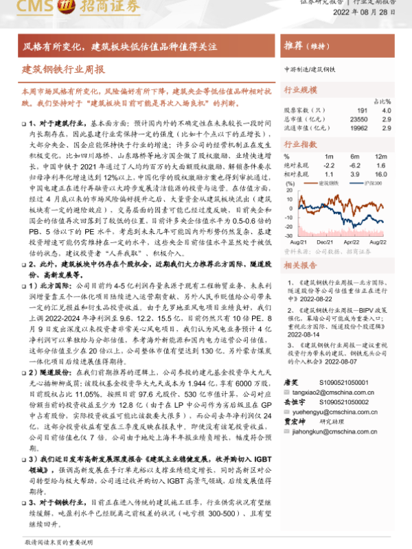 【海通证券】【20220828】建筑钢铁行业周报:风格有所变化,建筑板块低估值品种值得关注-3页