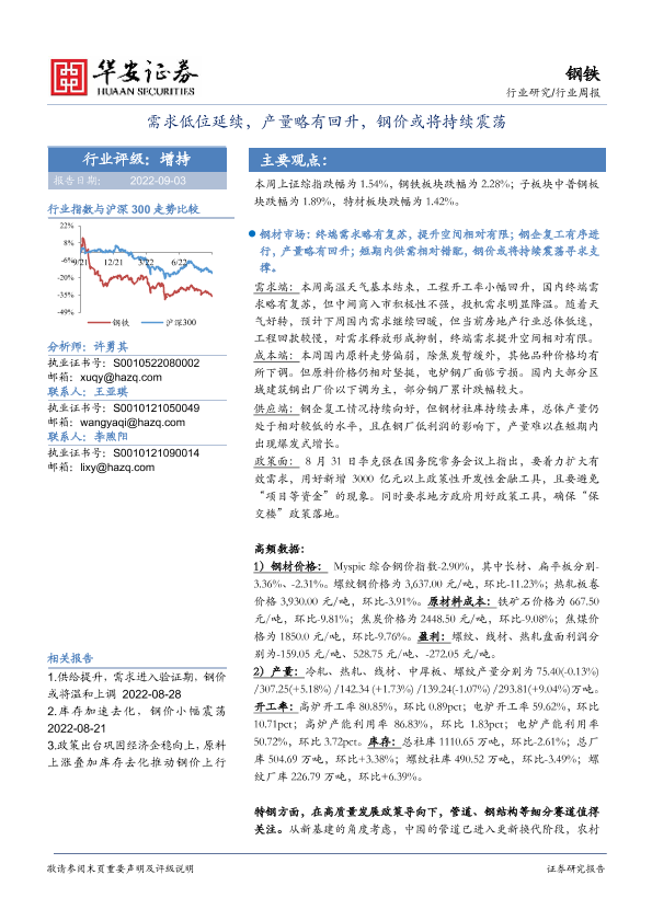 【华安证券】【20220903】20220903-华安证券-钢铁行业周报:需求低位延续,产量略有回升,钢价或将持续震荡-14页