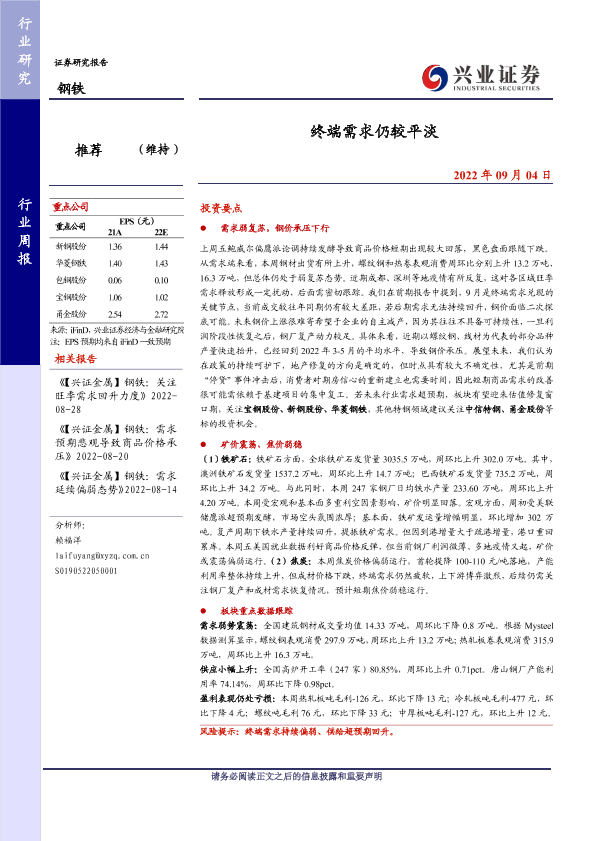 【兴业证券】【20220904】20220904-兴业证券-钢铁行业周报:终端需求仍较平淡-12页