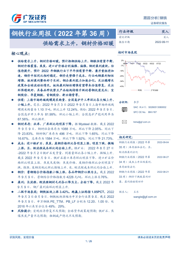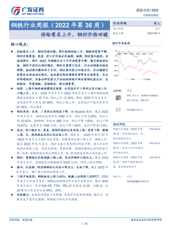 【广发证券】【20220911】钢铁行业周报(2022年第36周):供给需求上升,钢材价格回暖-26页