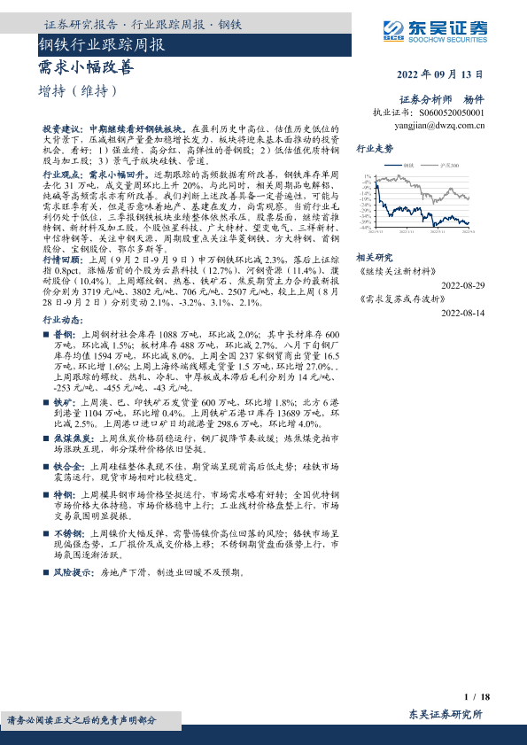 【东吴证券】【20220913】20220913-东吴证券-钢铁行业跟踪周报:需求小幅改善-18页
