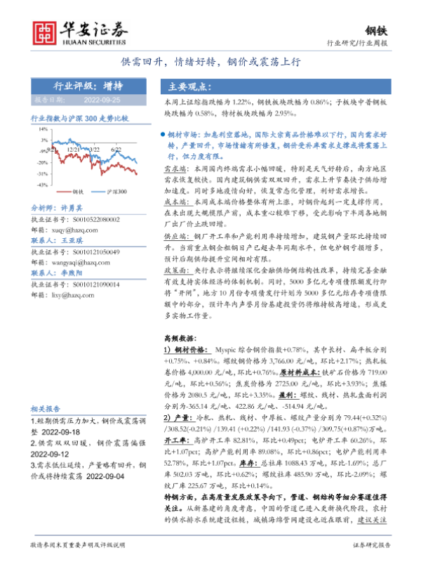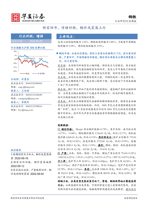 【华安证券】【20220925】20220925-华安证券-钢铁行业周报:供需回升,情绪好转,钢价或震荡上行-14页