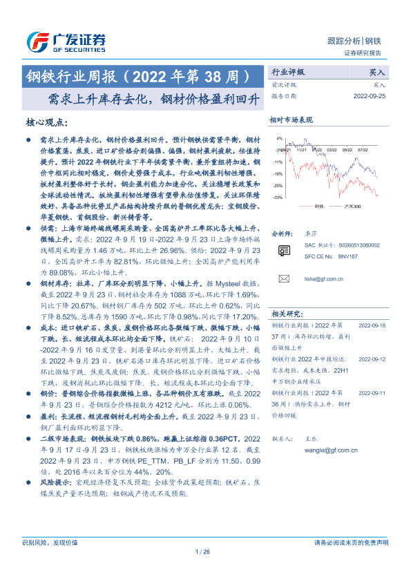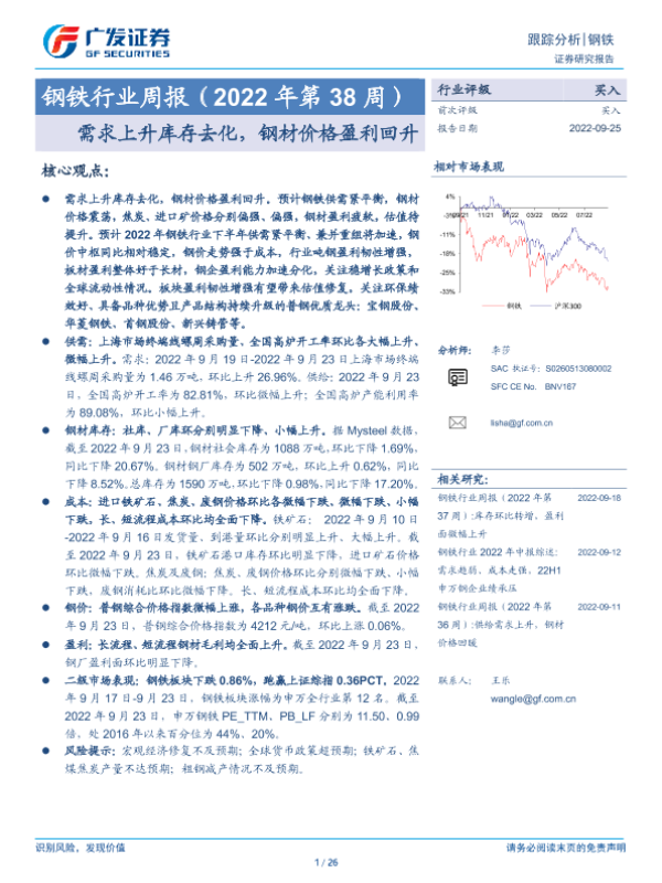 【广发证券】【20220925】钢铁行业周报(2022年第38周):需求上升库存去化,钢材价格盈利回升-26页