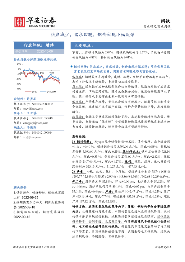 【华安证券】【20221009】20221009-华安证券-钢铁行业周报:供应减少,需求回暖,钢价出现小幅反弹-14页