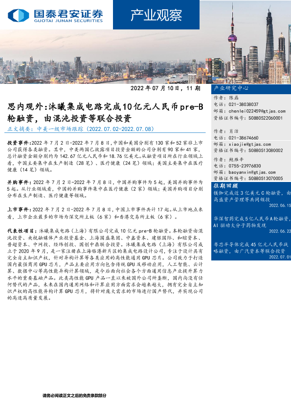 【国泰君安证券】【20220710】产业观察11期:思内观外,沐曦集成电路完成10亿元人民币pre_B轮融资,由混沌投资等联合投资-22页