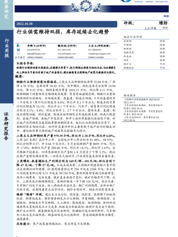 【国泰君安证券】【20221030】20221030-国泰君安-钢铁行业周报:行业供需维持双弱,库存延续去化趋势-25页