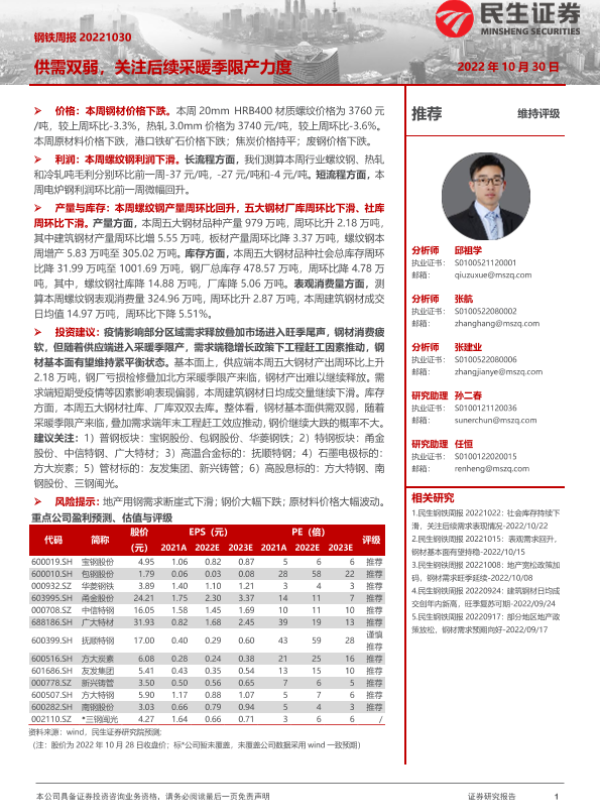 【民生证券】【20221030】20221030-民生证券-钢铁周报:供需双弱,关注后续采暖季限产力度-20页