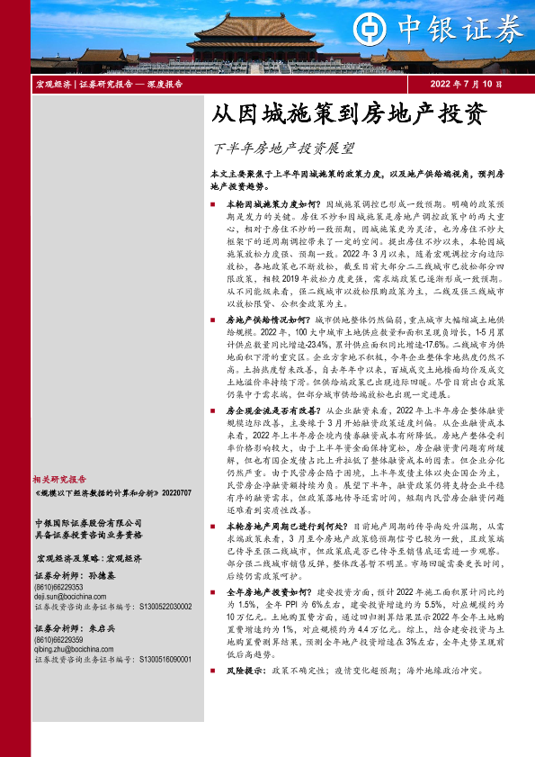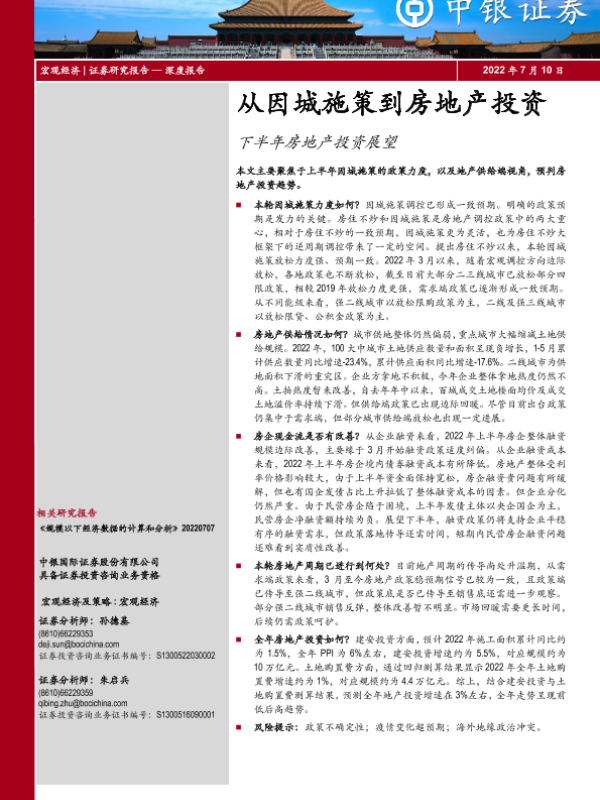 【中银证券】【20220710】从因城施策到房地产投资:下半年房地产投资展望-18页