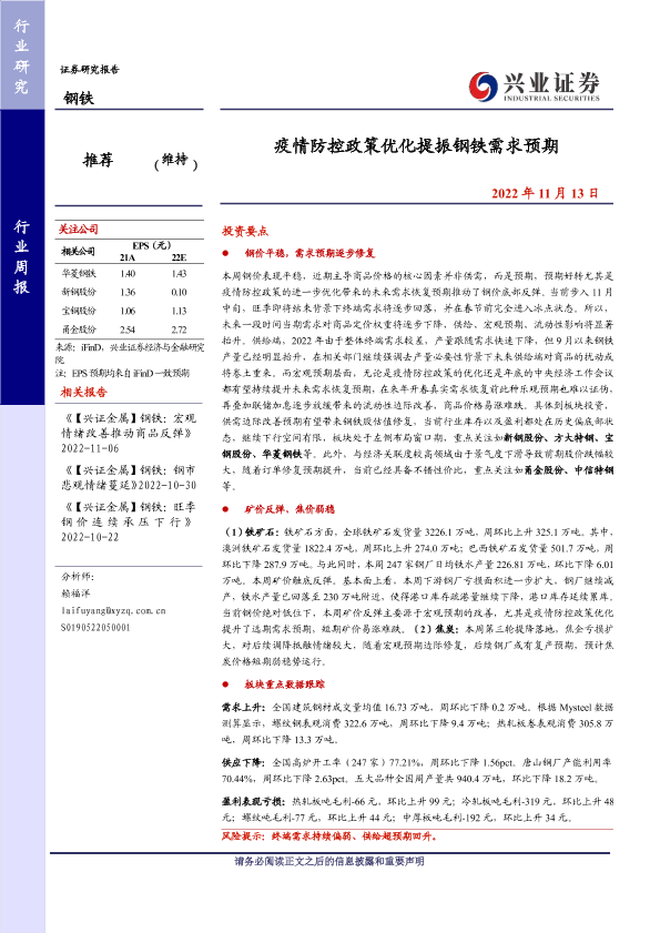 【兴业证券】【20221113】20221113-兴业证券-钢铁行业周报:疫情防控政策优化提振钢铁需求预期-11页