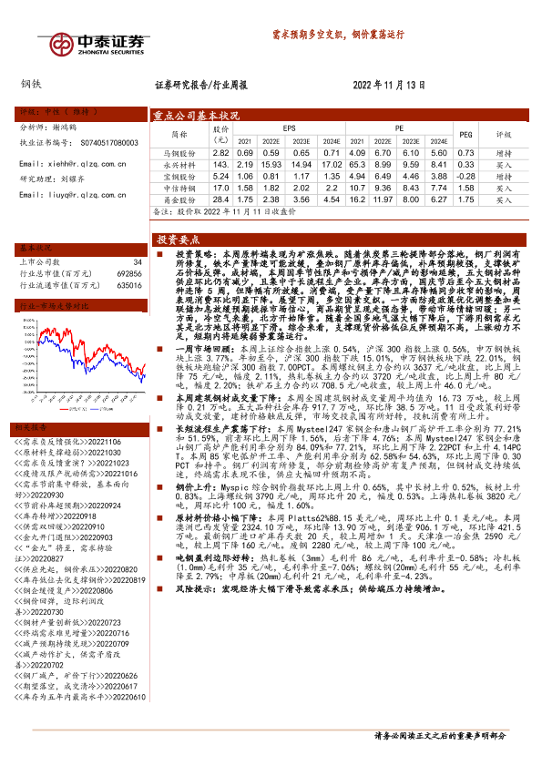 【中泰证券】【20221113】20221113-中泰证券-钢铁行业周报:需求预期多空交织,钢价震荡运行-14页