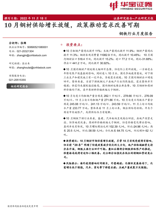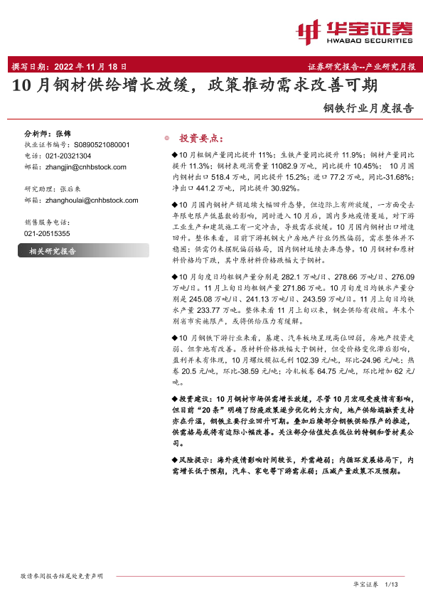 【华宝证券】【20221118】20221118-华宝证券-钢铁行业月度报告:10月钢材供给增长放缓,政策推动需求改善可期-13页