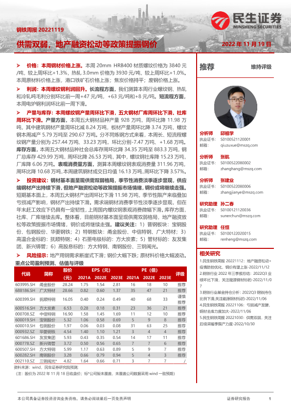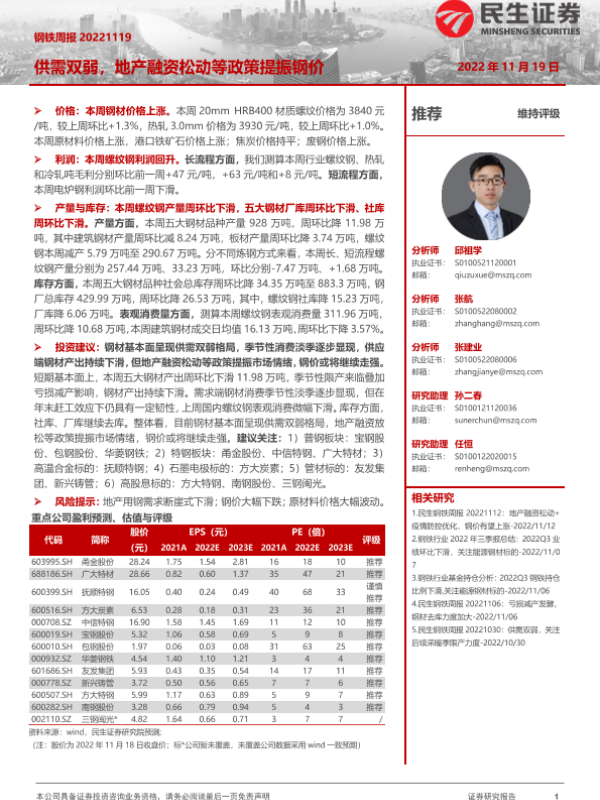 【民生证券】【20221119】20221119-民生证券-钢铁周报:供需双弱,地产融资松动等政策提振钢价-20页