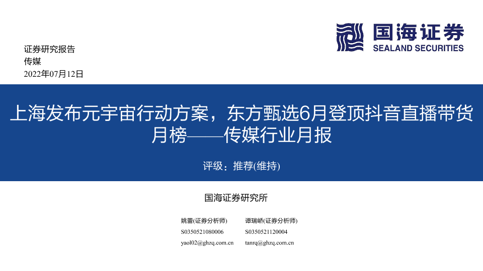 【国海证券】【20220712】传媒行业月报:上海发布元宇宙行动方案,东方甄选6月登顶抖音直播带货月榜-29页