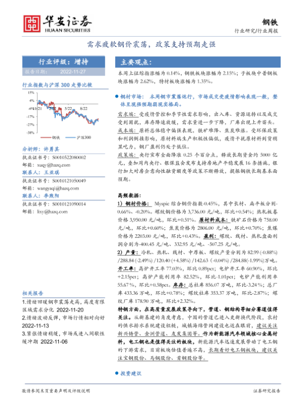 【华安证券】【20221127】20221127-华安证券-钢铁行业周报:需求疲软钢价震荡,政策支持预期走强-14页