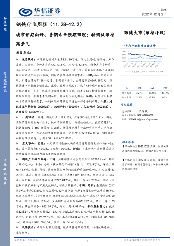 【华福证券】【20221202】20221202-华福证券-钢铁行业周报:楼市预期向好、普钢未来预期回暖;特钢板维持高景气-17页