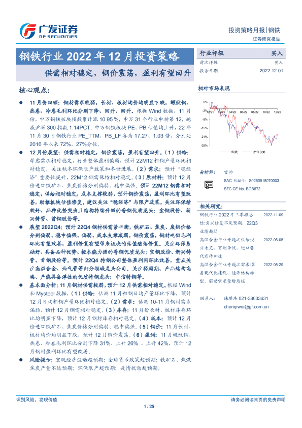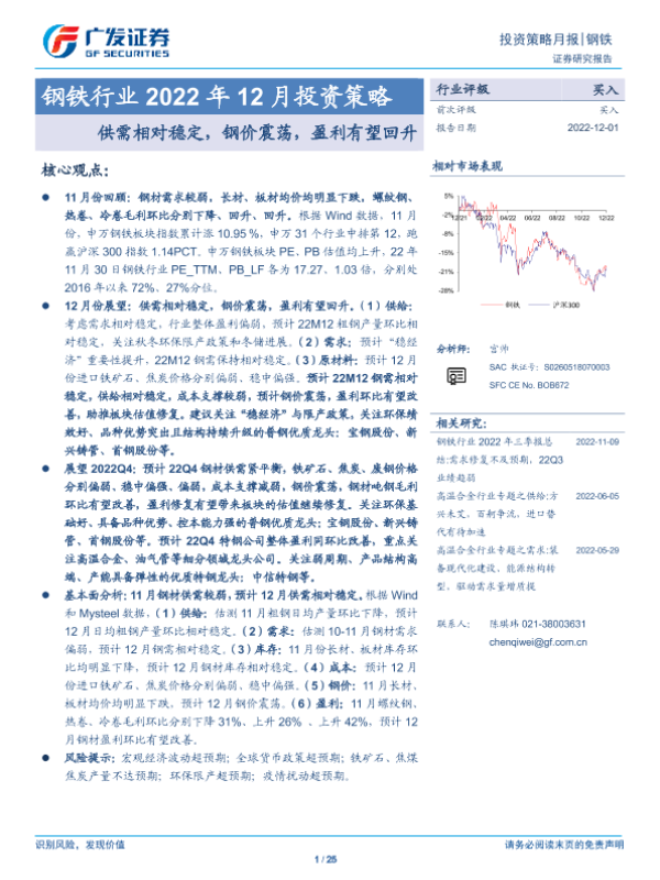 【广发证券】【20221201】钢铁行业2022年12月投资策略:供需相对稳定,钢价震荡,盈利有望回升-25页