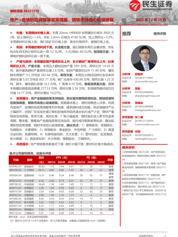 【民生证券】【20221210】20221210-民生证券-钢铁周报:地产+疫情防控调整等政策提振,钢铁市场信心延续修复-20页