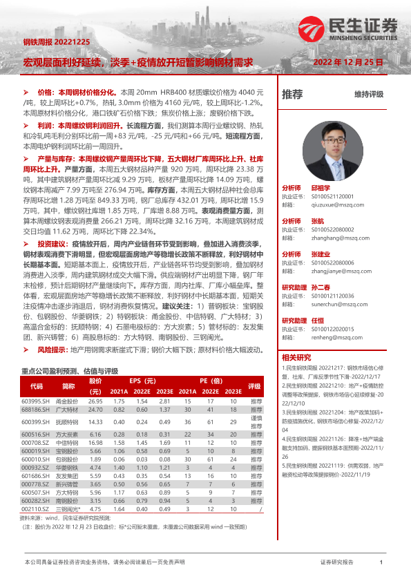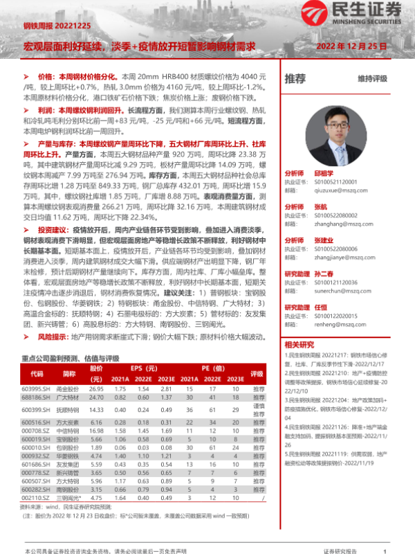【民生证券】【20221225】20221225-民生证券-钢铁周报:宏观层面利好延续,淡季+疫情放开短暂影响钢材需求-20页