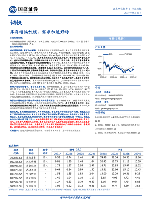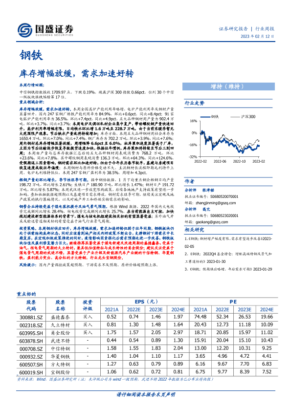 【国盛证券】【20230212】20230212-国盛证券-钢铁行业周报:库存增幅放缓,需求加速好转-16页