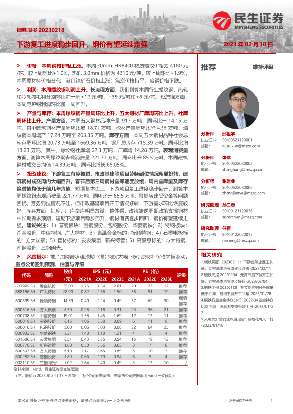 【民生证券】【20230218】20230218-民生证券-钢铁周报:下游复工进度稳步回升,钢价有望延续走强-20页